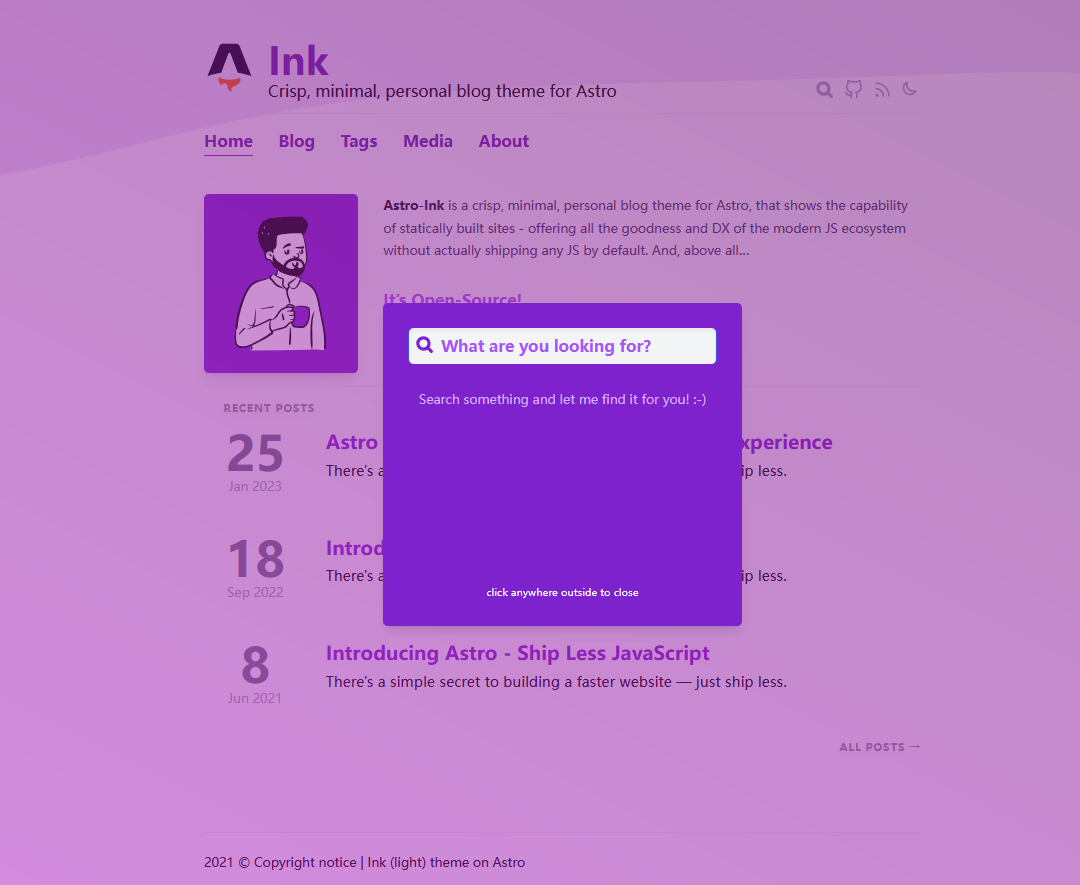 /src/draftsdirectory with a futuredatein theYYYY-MM-DDformat, and let a specially crafted Github Action take care of auto-publishing it on your specified date. You can configure the check interval in Github Action. - Client-Side Search - Allow your users get to your blog posts quickly with client-side search feat. Lunr.js