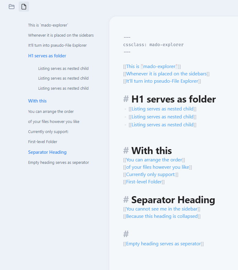 cssclass: mado-explorerWhen placed onto the sidebar, it will become exactly like how File Explorer would look like. A.k.a. pseudo-File Explorer! There are rules for this to work: