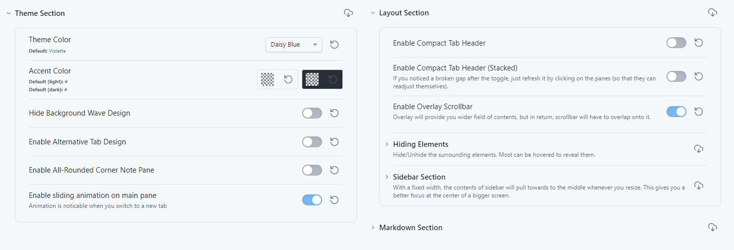 - Customizable theme colours, basic layout modifying, element hide-&-unhiding, and some basic markdown styling.